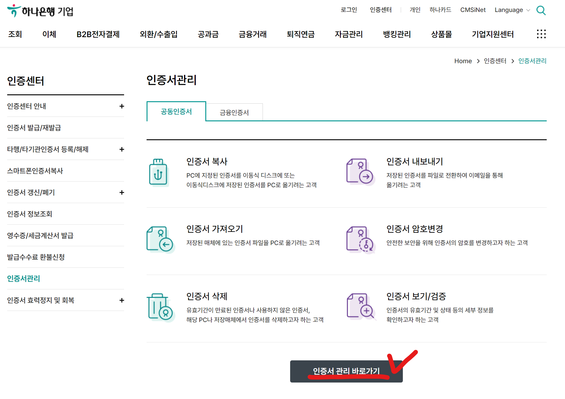 2. 은행 공인인증센터(법인일 경우 기업뱅킹>공인인증센터) 접속(여기서는 하나은행을 예시로 사용함)